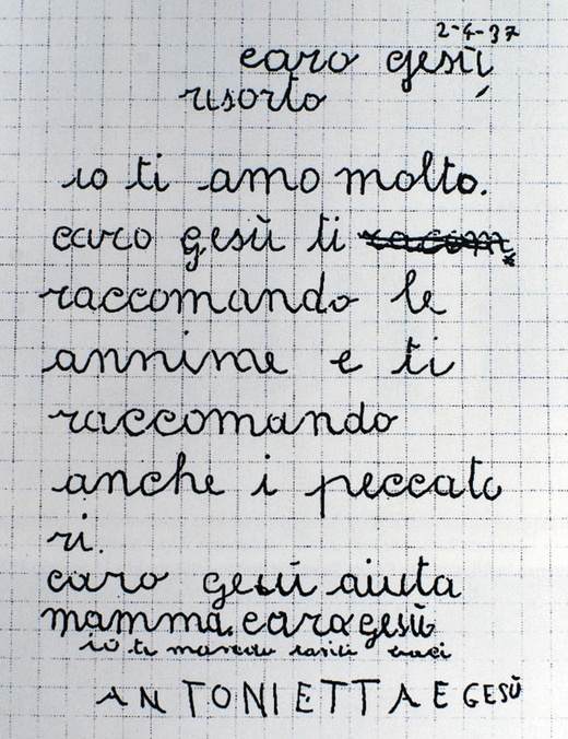 – Mamo, widziałam Jezusa! – usłyszała któregoś dnia Maria Meo. – Idź, pobaw się w ogrodzie. Widzisz, że gotuję teraz obiad. – Mamo, ale ja naprawdę Go widziałam – dziewczynka nie dawała za wygraną. – Antonietta, idź do ogrodu, albo pomóż mi przy obiedzie. Dziewczynka zbiegła po białych marmurowych schodach. Dlaczego nikt nie chce jej wierzyć? Mama westchnęła: „Co ta mała wygaduje? Jej fantazja nie zna granic…”. Nie, nie była niedowiarkiem. Od lat należała do Trzeciego Zakonu świętego Franciszka, ale nie mogła pojąć, że jej pięcioletnia córka może otrzymać tak wielką łaskę. Gdy jednak Nennolina poprosiła mamę, by spisywała listy do Jezusa, które ona będzie jej dyktować, pani Maria umówiła się na spotkanie z księdzem. – Antonietta ciągle opowiada o Jezusie. Wczoraj podobno widziała Go w ogrodzie. Wisiał na krzyżu, a przy nim stała Matka Boska! Prosi, bym w jej imieniu pisała listy do Jezusa. Co robić? Ksiądz znał świetnie małą Antoniettę. Widział, jak często szalała przed bazyliką. Chyba przeczuwał, że dziewczynka nie kłamie, bo pani Maria usłyszała: „Proszę spisywać te listy”.
